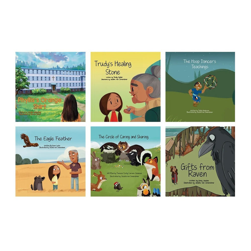 Coffret de 6 livres de rimes à couverture rigide « Medicine Wheel Education » (anglais). Comprend nos six livres d'éducation populaires, inspirés du programme scolaire des Premières Nations, recommandés pour les 4 à 6 ans : La Plume d'aigle, Les Cadeaux du Corbeau, Le Cercle de l'entraide et du partage, La Pierre de guérison de Trudy, Les Enseignements de la danseuse du cerceau et La Chemise orange de Phyllis.