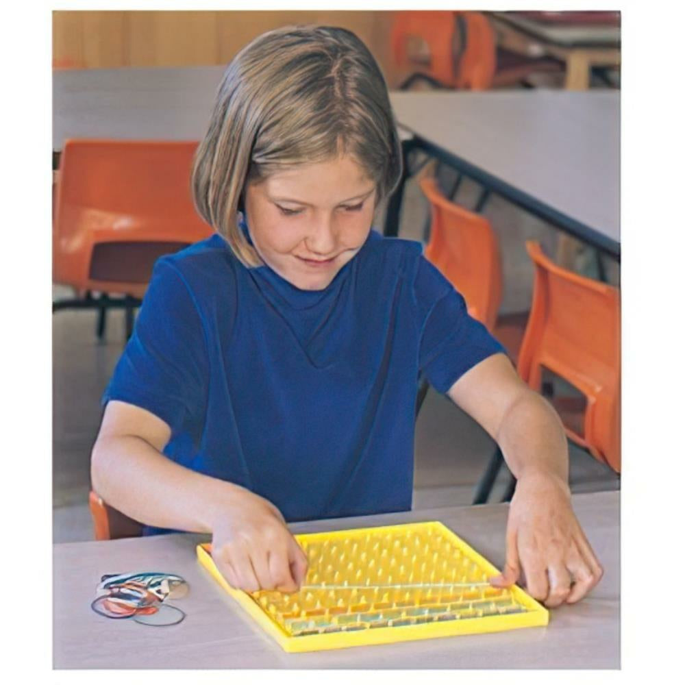 Tableau en plastique durable unilatéral avec matrice carrée de 11 x 11 broches. Jaune. De la maternelle à la 3e année.