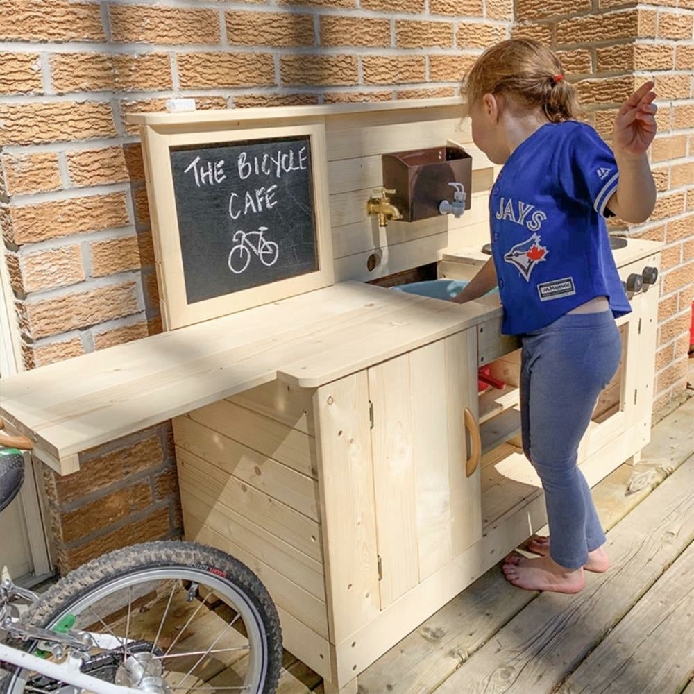 Comprend un tableau noir, un four miniature, une cuisinière 4 feux, un lavabo, un distributeur d'eau, un raccordement pour robinet, une porte de placard verrouillable, des étagères de rangement et un plan de travail coulissant pour étendre le jeu. Raccordez un tuyau d'arrosage au robinet pour un accès instantané à l'eau ou remplissez le distributeur d'eau situé au-dessus de l'évier. Dimensions : 110 x 90 x 43 cm.