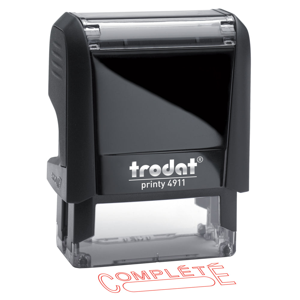 Tampon auto-encreur Trodat portant le message COMPLÉTÉ et un espace pour la date. Compact et léger, il facilite la manipulation et le positionnement de l'empreinte. Ce tampon à message contient au moins 65 % de matériaux recyclés post-consommation. Pour plus d'informations, consultez le site www.environment.trodat.net.