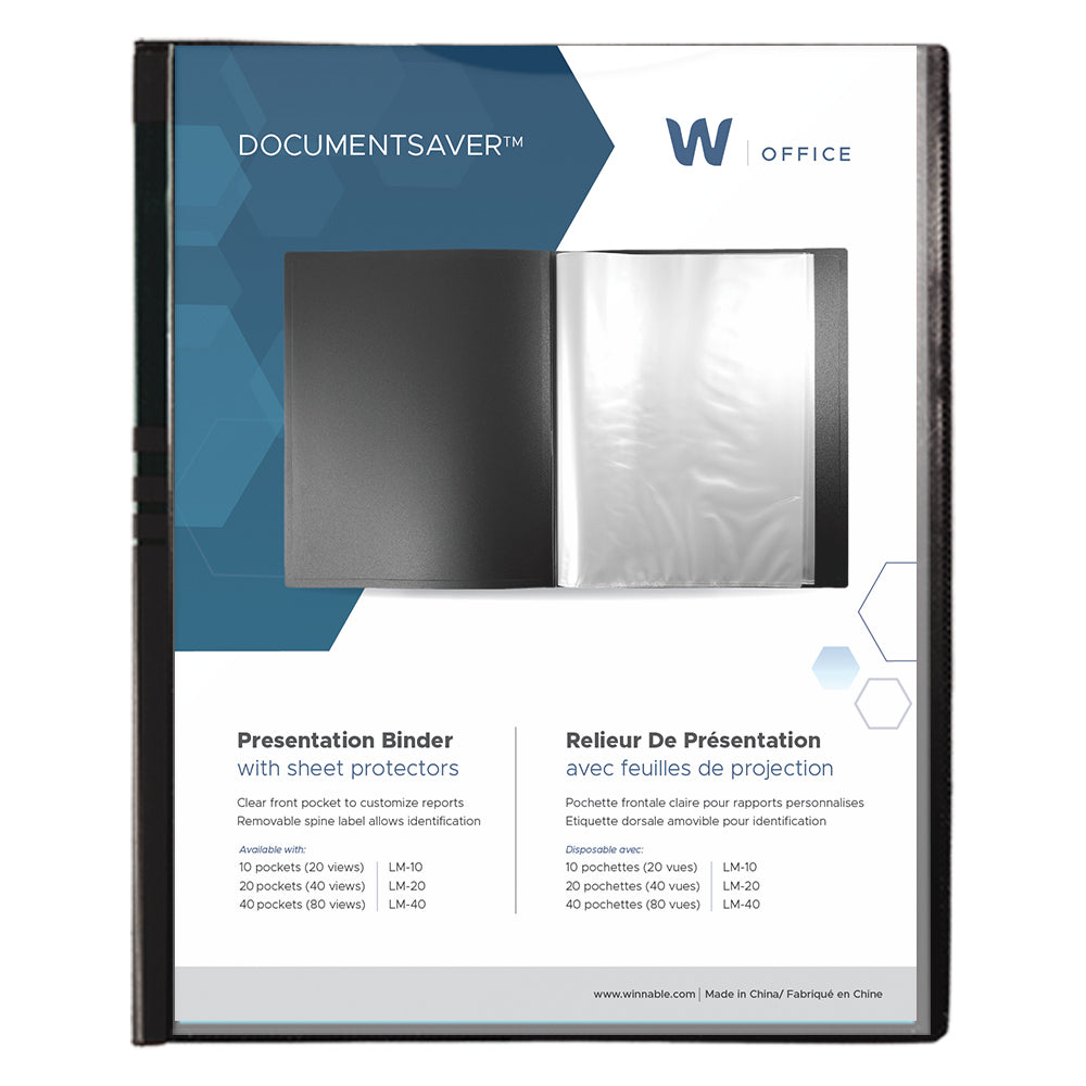 Le Document Saver est doté d'une couverture robuste en polypropylène avec une pochette transparente à l'avant pour personnaliser vos rapports et de 10 pochettes intérieures transparentes pour protéger et afficher vos documents. Les pochettes sont ouvertes sur le dessus.