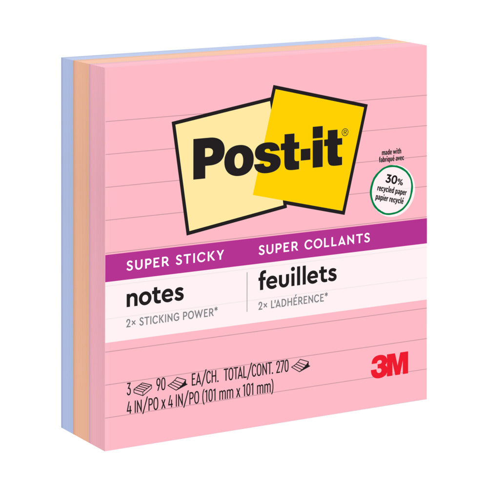 Post-it Super Sticky Recycled Notes in 4 in x 4 in feature 2x the sticking power. Use for lists or longer notes on doors, windows or walls. Unique adhesive reliably sticks and re sticks so your message can stay front and center. Move your notes with you throughout the day. Made with 30% recycled paper. Post-it Super Sticky Notes are recyclable and the paper in Post-it Super Sticky Notes is sourced from certified, renewable and responsibly managed forests. 3 Pads/Pack, 90 Sheets/Pad.